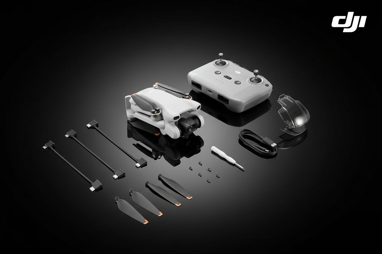 1 drone DJI Mini 3, télécommande DJI RC-N1, batterie intelligente, chargeur, câbles de connexion (Lightning, USB-C, Micro-USB), hélices de rechange, manuel d'utilisation en français.