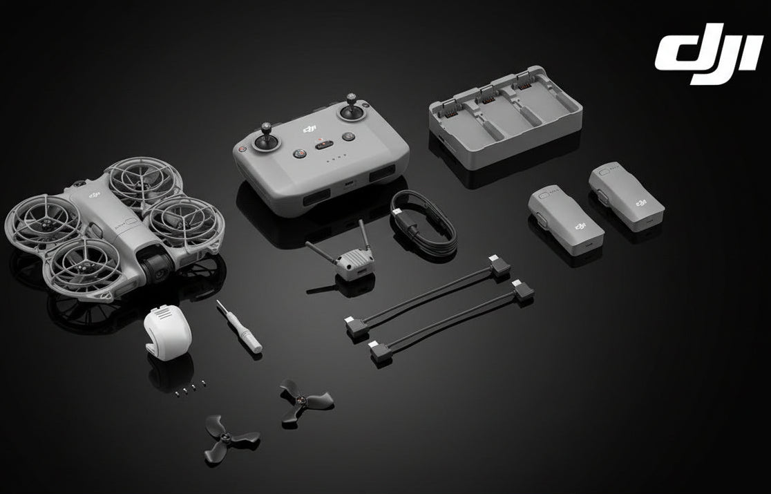 Contenu : 1 drone DJI Neo 2 avec protection intégrale des hélices, télécommande, batterie, câble de charge, hélices de rechange, manuel d'utilisation en français.