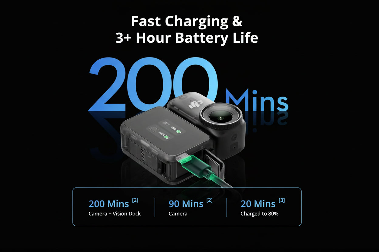 - Autonomie prolongée – Plus de 60 minutes en 4K/30fps, charge rapide à 80% en 20 minutes
