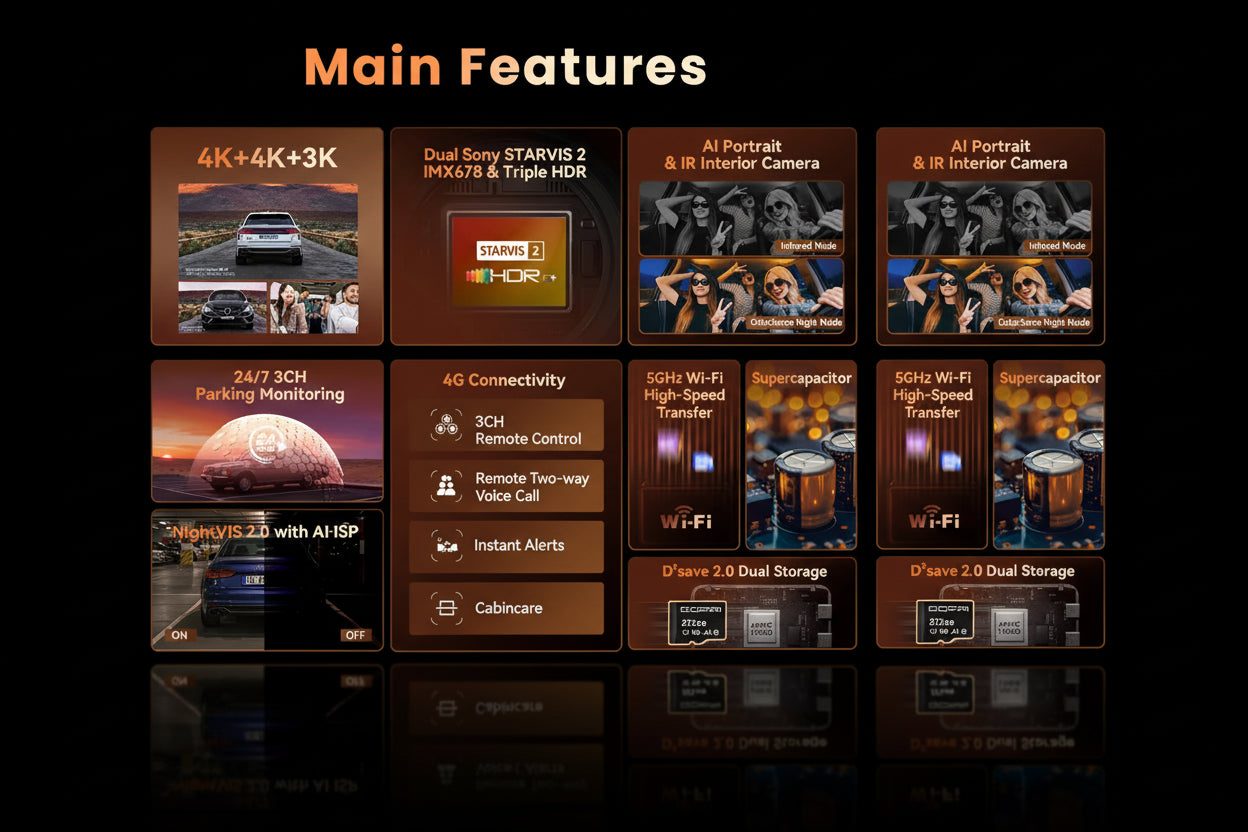 - Triple caméra 4K+4K HDR – Couverture complète avant, arrière et intérieure avec qualité d'image exceptionnelle