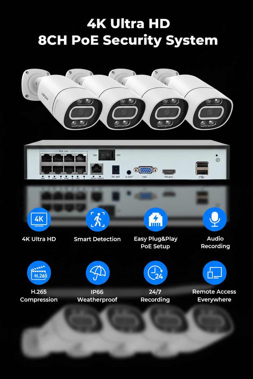 Idéal pour : Maisons individuelles, commerces, bureaux, entrepôts, parkings, ou toute propriété nécessitant une surveillance professionnelle 4K avec possibilité d'extension.